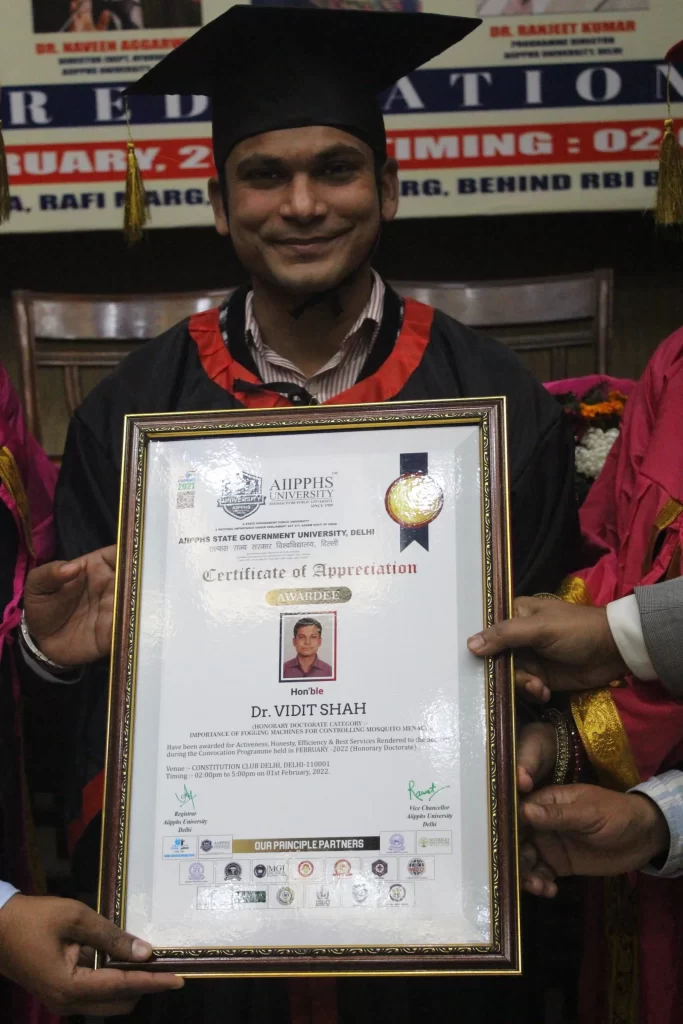 We are not just here because we can make fogging machine, Our founder Dr. Vidit Shah has been awarded PHD in “Importance of Fogging Machine for Control of Mosquito Menace” by AIIPPHS STATE GOVERNMENT UNIVERSITY DELHI. This knowledge & experience translate into our premium quality products & services.